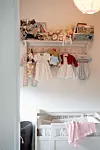 Kortveggen på barnerommet har fått en tilsynelatende eksklusiv skapinnredning som dekker hele veggflaten og har en implementert stellebordløsning i midten.