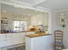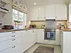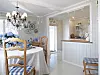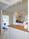 Den kremhvite standardfargen er lys og lun, og harmonerer godt med kjøkken- og stueveggene, som er malt i en sommerlig nyanse av brukket hvitt med innslag av blått.