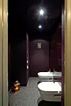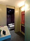 - For å oppnå ekstra volum og dybde ble dørene som utgjør endeveggen høyglanslakkert hos en billakkerer. Overflaten ble så blank at den speiler hele rommet og matcher den nesten like blanke veggen på toalettet, sier Amundsen.