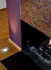 Blant annet måtte det nye, massive eikegulvet flukte med flisene i dusjsonen. Peisen på motsatt side er lagt på nivå med detrobuste eikegulvet. Peiskappen like overbrennkammeret er markert med et stort flisefelt i varme, glitrende fargetoner.