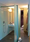 Ideen om dusj midt i stuen kom da interiørarkitekten og beboeren oppdaget muligheten for å gjøre en lang og smal stue og et lite bad om til et større allrom.