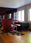 Tverrveggen i den lilla stuen er bygd opp av kjøkkenskap fra gulv til tak, og bak dørene skjules stereoanlegg, tv og andre duppeditter.