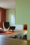 Langveggen ut mot gaten er i rå betong, mens innerveggen rett imot den store, lave gruepeisen er malt i en tone som minner om italiensk murpuss eller toskansk jord. Alle vinduskarmer i leiligheten er fjernet og murt opp igjen i en stram stil, og alle døråpninger er blitt utvidet.