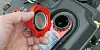 Å tappe den gamle oljen kan du gjøre ved å bruke oljesugeren eller tappe fra røret som stikker ut bak motoren.