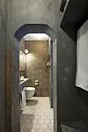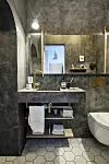 Stian ønsket seg et bad med et annerledes og røft utseende, som også skulle fremstå som eksklusivt og avslappende. For å få det til har han kombinert mikrosement med marmor, eik og messing.