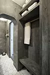HYLLER I MIKROSEMENT: Fra selve badet er det gjennomgang til dusjen. Her har Stian satt opp hyller til håndklær og en sittebenk, også de kledd i mikrosement.Ann Helen Lund