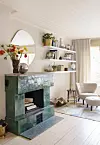Peisen, kledd med håndlagde zellige-fliser fra Ulfven, er midtpunktet i allrommet. Speilet over er fra Ferm Living, og på peishyllen står en vase fra Hein Studio og sølvkule fra Milla Boutique, der også skjellet på gulvet kommer fra. Vegghyllene er fra Ikea, teppet fra Volver Studios og gardinene fra Mimou. Lenestolen med fotpall er Lille Petra fra &Tradition, mens det lille bordet er et bruktfunn. Den lune veggfargen er spesialblandet for dette rommet, en lys fersken med like mengder gult og rødt i seg.Yvonne Wilhelmsen