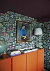 Arbeidsrommet har fått spenstige farger. Tapetet er Vårklockor av Josef Frank for Svenskt Tenn, mens takfargen er Plum fra Pure & Original. De oransje skapene er Ivar-moduler fra Ikea, malt i en egenmikset kulør. Yvonne Wilhelmsen