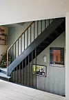 Trappen er original fra byggeåret og var en av tingene som Kristoffer og Elisabeth falt for på visningen. Veggene er malt i fargen Krydderurt fra Jotun, og på veggen ned mot inngangsetasjen henger en konsertposter for Motorpsycho, sammen med en plakat fra kunstmuseet Louisiana i Danmark og en avstøpning av Edvard Munchs dødsmaske. – En kuriosa fra min manns eklektiske kunstsamling, sier Elisabeth. Yvonne Wilhelmsen