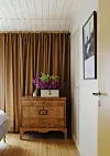 Soverommet var først malt i en dyp, grønn nyanse, men har fått et helt annet uttrykk med kuløren Double Cream fra Farrow & Ball. De konjakkfargede gardinene er fra Mimou. På den arvede kommoden står et smykkeskrin fra Jonathan Adler, anskaffet hos Bellas Hus. Yvonne Wilhelmsen