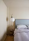 Sengegavl og -ramme har Kristoffer og Elisabeth bygget og polstret selv. Hele sengen er trukket i tekstilet Polka fra Linwood, via Intag. Det lavendelfargede sengetøyet er fra Myyk, nattbordet Ball Stool fra Pols Pottern og lampen Nelson Ball Wall Scone fra Hay, via OsloDeco.Yvonne Wilhelmsen