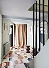 Gulvflisene i entreen er spesialbestilt i egne farger, med mønster fra Popham Design i Marrakech. Bak forhenget fra Svensson er det klesskap og skooppbevaring. Speilet er fra Ikea og krakken Ball Stool fra Pols Potten, via SenseOn. På veggen til høyre henger et bilde som Elisabeths venninne har laget som bursdagsgave, og på motsatt side henger en spesialbestilt Henrik Placht-akvarell, en bryllupsgave fra Elisabeths tidligere kollegaer i Koi Fargestudio.Yvonne Wilhelmsen