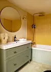 Fargepaletten på badet er en god miks av hva Elisabeth og Kristoffer ønsket seg. Veggene på badet er malt i fargen Nutmeg Powder fra Pure & Original. Gulvfliser og stavfliser foran badekaret er fra Fired Earth, de okergule flisene fra Fagflis. Servantmøbelet og servanten er fra Flisekompaniet, kranene fra Tapwell. Speilet er fra House Doctor, mens vegglampen er et loppemarkedkjøp.Yvonne Wilhelmsen
