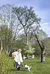 Hun er på vei ned til favorittplassen ved kirsebærtreet. Der har hun dekket et lite bord hun fant på bruktbutikken, med gammelt porselen.
