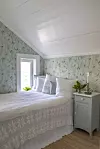 SOVEROM: Fuglerommet har Elin døpt dette soverommet på kvisten. Her har hun valgt tapet med fugler i lys grønn og hun har planer om flere fugledetaljer etterhvert.Lise Mari Stang-Jacobsen