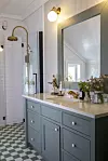 SJAKKMØNSTRENDE FLISER: Sjakkmønstrede fliser hører med til et gammelt hus. Badet får et eksklusivt preg med kran i messing, fra Tapwell. Benkeplateten er Silestone Lagoon. Lamper fra Karlskrona Lampfabrik.Lise Mari Stang-Jacobsen