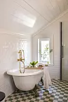 På badet oppe har de fått båret opp et blytungt badekar med løveføtter, og gardinstengene har Elin selv lagd for å få den gammeldagse følelsen.