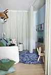 – For å skape en trygg ramme rundt sengen og samtidig hindre kulderas fra vinduet, kom jeg på ideen med gardiner fra gulv til tak. Når jeg først var i gang lekte jeg med muligheten for å dra gardinen helt gjennom rommet, noe familien likte.