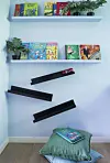 LEKER: Bak døren er plassen utnyttet til innebygde bokhyller og en smart bilbane: Tre Mosslanda kildelister fra Ikea er skrudd fast i et mønster som gjør det morsomt å slippe biler eller klinkekuler ned.Filippa Tredal