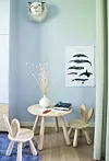 FLOTT ROM: Martins nye rom er dust og mykt, med masse tekstiler, runde former og forsiktige nyanser av blågrønt. Sengen er hans gamle. Det var viktig for ham å ha noe kjent i alt det nye, pluss at familien ikke så noen grunn til å bytte ut et godt møbel. Skapdørene er spraylakkerte i samme farge som veggen, S0515-R90B helmatt. Dyrehoder fra Jollyroom, gulvteppe fra Jab og nattbord fra Kartell.Filippa Tredal