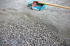 Når hellene er lagt, metter du fugene med sand. Ytterst der vannet renner av plattingen kan du avslutte med en liten klatt betong i fugen slik at sanden ikke blir vasket ut.