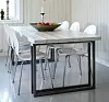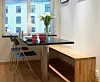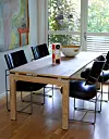 Kjøkkenbord med steinplate. Kjøkkenet er lite, og utfordringen var å lage et bord som ga størst mulig spiseplass på minst mulig areal. Løsningen ble å utnytte vinduskarmen som bordflate og støttepilar. På hver side av bordflaten er det felt inn en steinplate slik at hele vinduskarmen går i ett med bordet. I tillegg hviler den nesten 200 kg tunge steinplaten på en søyle i børstet stål som er sveiset fast i en rund plate under bordet for å gi økt stabilitet. Ettbeinsløsningen gir rikelig med plass under bordet og sørger for at stoler og bein har fritt spillerom. Løsningen er tegnet og utarbeidet av Joachim Løland.