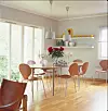 Dør. Et dørblad med måltilpasset glassplate på toppen fungerer som spisebord i en herskapelig leilighet der dørene ble fjernet mellom stuene. Beina er av enkleste sort, fra Ikea.