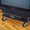 Tv-bord med plass til dvd-spiller. To like store sponplater skåret til hos trelasthandleren holdes på plass og fra hverandre med en lang skrue og muttere i hver ende. Hjul fra eksempelvis Clas Ohlson eller Ikea gjør det lett å flytte apparatet rundt.