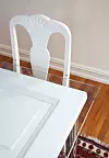 Spisebord av mdf. Bordet ble lagd til innvielsesfesten fordi pengene til innkjøp av møbler hadde gått med til oppussingen. Mdf-platen på 240 x 200 cm ble kjøpt hos en trelasthandler og avrundet i hver ende med elektrisk stikksag. For å få en jevn bue ble det lagt en tommestokk i plast langs langsiden av platen som ble buet over kortsiden før det ble tegnet etter med blyant. For å få litt mer liv i bordplaten ble den delt på midten. Kantene ble slipt og platen lakket med klar