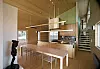 Rommene er holdt åpne. Veggene som deler kjøkken fra stue, og soverom fra allrom, er fleksible og går ikke fra gulv til tak; lyset får åpne veier og interiøret et helhetlig inntrykk.