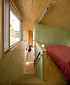 Innvendig er veggene dekket med ubehandlet granpanel. Slik har interiøret en sammenheng med naturen som omgir boligen.