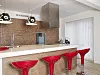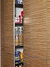 To av høyskapene i teknikkveggen er såkalte kolonialskap, som trekkes ut på glideskinner som en skuff. Hyllene er oversiktlige, med rekkverk av aluminiumsrør.Foto: Inger Mette Meling Kostveit
