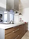 Arbeidsøya har benkeplate i 8 cm tykk Corian. For at arbeidshøyden ikke skal bli upraktisk, er den tradisjonelle sokkelen under skapene utelatt, og skapskrogene montert på en lavere sokkel. Skapfrontene er i finert valnøtt.Foto: Inger Mette Meling Kostveit
