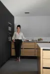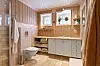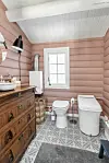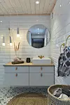 Funksjonelt: For å optimalisere plassen rundt toalettet, er den venstre delen av servantinnredningen grunnere enn partiet med skap og skuffer. Vinduene er bevisst plassert, slik at man kan stå ved vasken og titte ut, uten å bli eksponert for innsyn. Veggene er i all hovedsak kledd med stående panel, men i dusjsonen og rundt sisternen er det brukt samme tromlede marmorflis som på gulvet. Innredningen er levert av Heen Tre.Inger Mette Meling