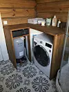 Åpen løsning: Her er en annen hjemmelaget variant, hvor hytteeieren har snekret et åpent skap til vaskemaskin, varmtvannsbeholder og trykktank. På gulvet er det lagt vakre fliser fra Historiske Fliser, noe som tilfører rommet ekstra personlighet.Ragnar Hartvig