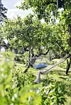 Hagen er stor og luftig, den har rikelig med frukttrær og en parsellhage hvor de sår salat, gulrøtter jordbær.