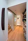 Det første møter vi allerede ved inngangen til leiligheten. Det er en renlinjet garderobeavdeling med skap på begge sider av det gamle soveromsvinduet. Det andre er et stort lagringsrom plassert midt inne i leiligheten i forlengelse av inngangssonen. Det er et flott, originalt og praktisk værelse med himmelhøyt under taket.