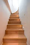 Et tidligere soverom i hovedetasjen ble bygd om til moderne bad og separat wc. Fra det opprinnelige, store soveromsvinduet flommer dagslyset inn og gir vakkert liv til de lekre kalksteinsveggene. Alle vegger, tak og bjelker ble malt i lyse farger. Et nytt, oljet eikegulv og en spesialtegnet peis prydet av vakkert finpusset mur kompletterer den lette, elegante stilen.