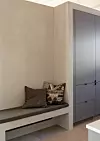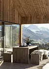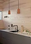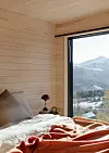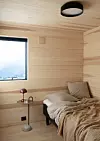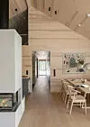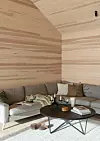 Inne er vegger og tak kledd med kvistfri furu, behandlet med voks, som vil få en gyllen lød med tiden.