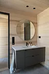 Grunntanken har vært å velge naturlige materialer med lang levetid, og treverk er derfor brukt både ute og inne. Fasaden er satt inn med jernvitriol som gir en jevn og vakker gråfarge.