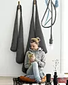 PRAKTISKE VEGGPUTER: Hvis man vil sitte på gulvet, kan det være praktisk med puter lent opp mot veggen. Disse grå putene, Gym de luxe i økologisk ull, kommer fra frachristinaliljenberghalstrom.blogspot.com, men er foreløpig ikke satt i produksjon. Knaggene i valnøtt følger med settet. Lampe med strikket kabel, 13 m, kr 2550, kvist-visdal.no.Foto: Linnea Press Lisbeth Hjort/Linnea Press