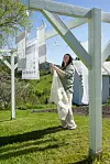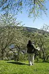 Mens Arild jobber med å redusere plenarealene og lager uteplasser av grus og stein, utvider Elin med flere frukttrær og nye stier mellom dem.