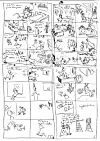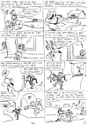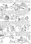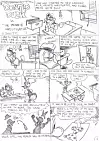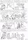Det neste jeg gjør er å dele historien inn i ruter med litt komentarer og veldig raske skisser for å se om det er noe å gå videre med. ( Første siden.) Er det noe å gå videre med skriver jeg tekst og dialog og tegner ferdig. ( De påfølgende fire sidene.) Det er i grunn det hele.