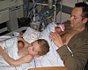 Storebror hjelper pappa med å gi tvillingene hudkontakt