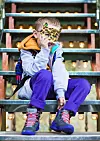 MASKERT: Trym har på seg bukse fra Name It, kr 230, sekk fra Roxy, kr 349, grå hettejakke fra Name It, kr 250, oransje hettejakke fra Quicksilver, kr 599, fjellsko fra Ecco, kr 999 og maske fra Standard.FOTO: Astrid Waller