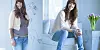VENSTRE BILDE - HVERDAG: Kamelfarget genser i tynn bomull, kr 149, fra Vila. T-skjorte, kr 239, fra Petit Bateau og kort, strikket kardigan, kr 299, fra Vila. HØYRE BILDE - FEST: Her er jeansbuksa stylet til fest sammen med en topp med strikk, som kan dras over eller under magen, kr 599, fra Vila. Armsmykke, kr 998, kors- og hodeskalleanheng, kr 298 pr. stk., alt fra Arts & Crafts.FOTO: Astrid Waller
