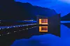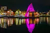 PUST TROMSØ: Den flytende badstuen ligger midt i Tromsø havn, ytterst på gjestebrygga med bademuligheter rett utenfor døra. Lyset bygningen blir badet i skal illustrere nordlyset eller midnattsola. Det sier sitt at det kjente internasjonale reisemagasinet Time Out i en artikkel omtaler Pust som din nye spa-fantasi. Yngve Olsen/Visit Norway