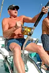 Nå er det blitt stille fra storfiskeren fra Moss. Skatene har tatt seg en middagslur, og østfoldingene og jeg sludrer om løst og fast, drikker litt øl og sløver i sola. Men så rykker det endelig litt i stangtoppen til Helge fra Sarp, og Roberto beordrer ham i stolen. Skal endelig Helge også få fisk? Bjørn kommer med optimistiske tilrop. Sarpingen svetter i sola, og pumper den tunge fisken oppover.