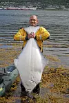 - Etter ett par småfisker satte jeg på en hel liten torsk i jakt på stortorsk eller kveite. Det tok ikke mer enn 4 minutter før storfisken bet på. Min stakkars gjest fisket fortsatt agn, og fikk ikke sjansen til å fiske mer denne dagen. Jeg er vel en dårlig vert, humrer Svenson - og legger til at han kunne se sitt eget hus under hele fighten.