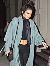 Senere samme dag stilte Jenner i nok et antrekk bestående av magetopp og bukse. Denne gangen gikk hun for skinnbukser stylet med en sort topp, en blå kåpe og et trendy skjerf i halsen.